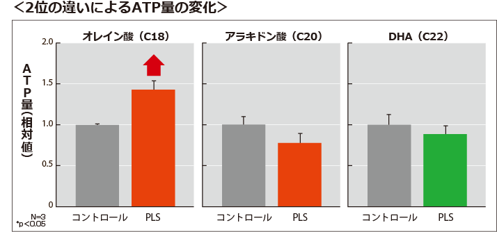 ATPは細胞への障害性が大きい程、細胞内での量が減少します。アラキドン酸を添加し6時間後のコントロール区割合を1としたときの相対値にて、2位骨格にオレイン酸が結合したプラズマローゲンは、コントロールと比較しエネルギー量が増加し、ATP産生量の回復傾向が見られましたが、アラキドン酸結合型、DHA結合型については変化がみられませんでした。